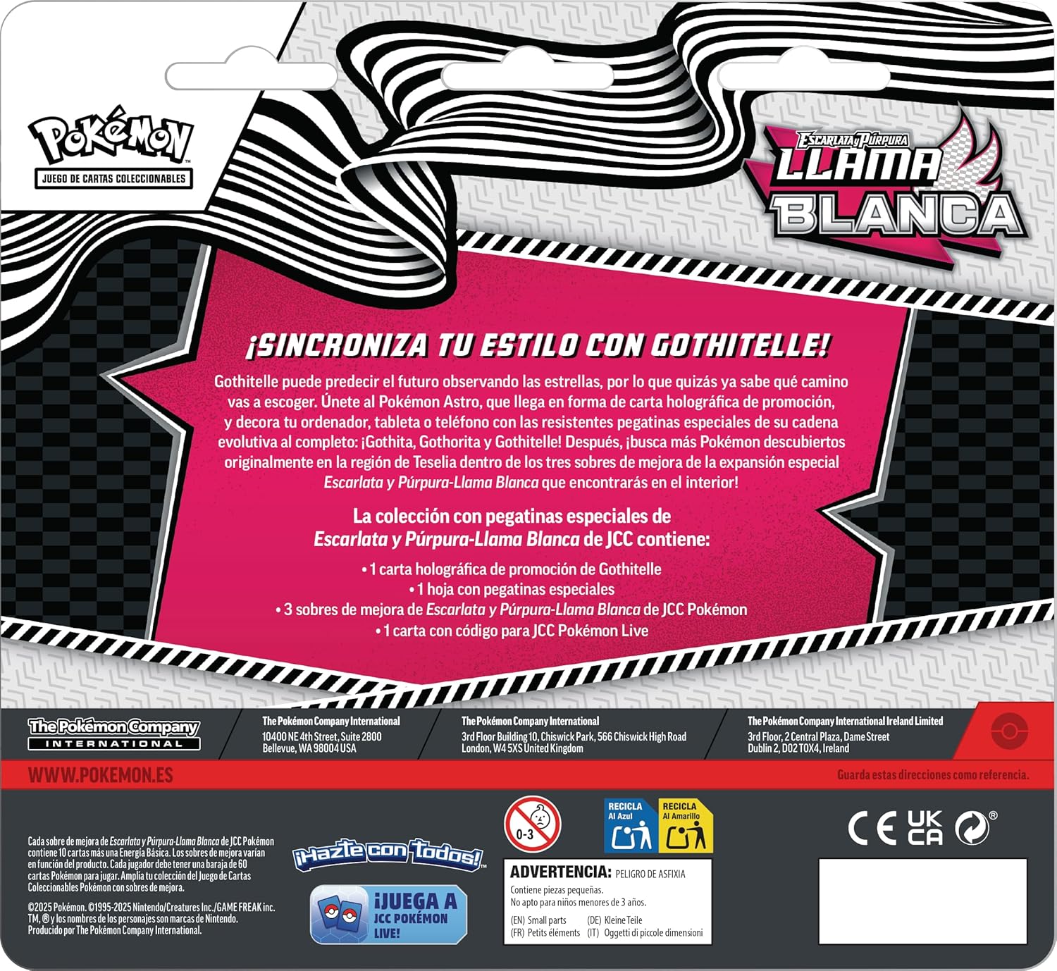 La colección incluye también pegatinas temáticas exclusivas y sobres de mejora de la expansión Llama Blanca, parte de la serie Escarlata y Púrpura. Ideal para jugadores, fans de la estética gótica o coleccionistas que buscan algo diferente.