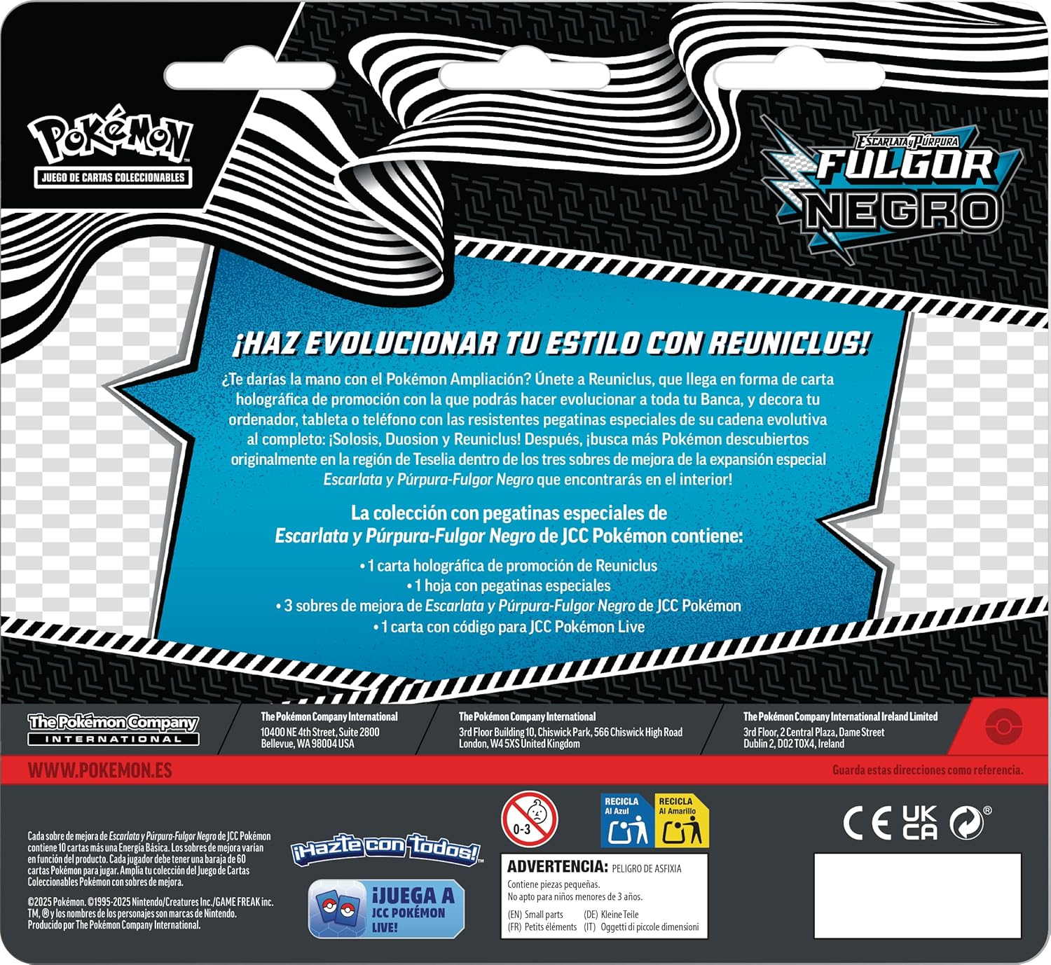 La colección incluye también pegatinas temáticas exclusivas y sobres de mejora de la expansión Fulgor Negro, parte de la serie Escarlata y Púrpura.